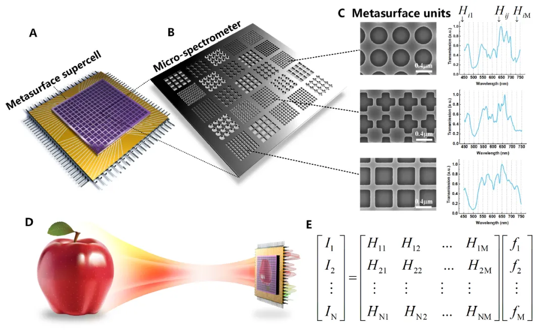 例如,清华大学黄翊东教授团队在2020年研制出了首款实时超光谱成像芯片[5],其利用硅基超表面实现了对入射光的频谱域调制,通过改变超表面单元的结构参数实现不同的调制函数,利用CMOS图像传感器实现频谱域到电域的投影测量,再通过压缩感知算法重建得到入射光的光谱,并进一步通过超表面的大规模阵列集成实现实时光谱成像。同年成立了与光科技公司开始商业化运作,目前已实现规模化量产并推向市场。