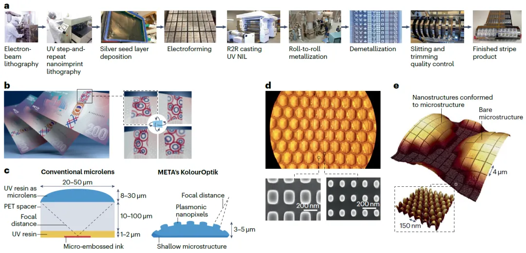 纸币中使用的安全特征(KolourOptik Stripe)由通过金属化纳米压印聚合物制成的等离子体颜色像素元素组成,将不同尺寸的等离子体纳米结构与微结构相结合,可以在薄膜中嵌入多种功能,例如颜色变化、动态效果和三维深度。其R2R纳米压印制造步骤和超表面结构示意图如图6所示,首先通过电子束光刻制备高精度的初始硬模板,并通过纳米压印复制至软印章。软印章随后用于分步重复的压印工艺以构建大面积重组模板,并最终转制为具备足够机械强度的硬印章,以适应卷对卷(R2R)压印制造需求。高质量地将纳米结构从原始模板转移至最终硬印章,是确保器件光学性能的关键。