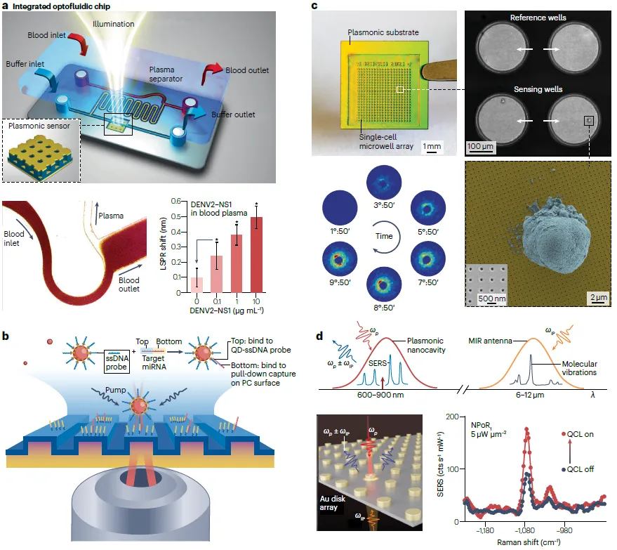 振动光谱技术(如红外吸收和拉曼散射)可实现非标记、化学特异性和构象敏感的检测。但由于本征信号强度低,纳米光子学发展出两种增强方法:更成熟的表面增强拉曼散射和新兴的表面增强红外吸收,后者适用于微量样品的高灵敏测量。最新研究表明,等离子体纳米腔可在中红外和近红外光谱范围内提供场增强,有助于实现反斯托克斯拉曼发射(图8d)。