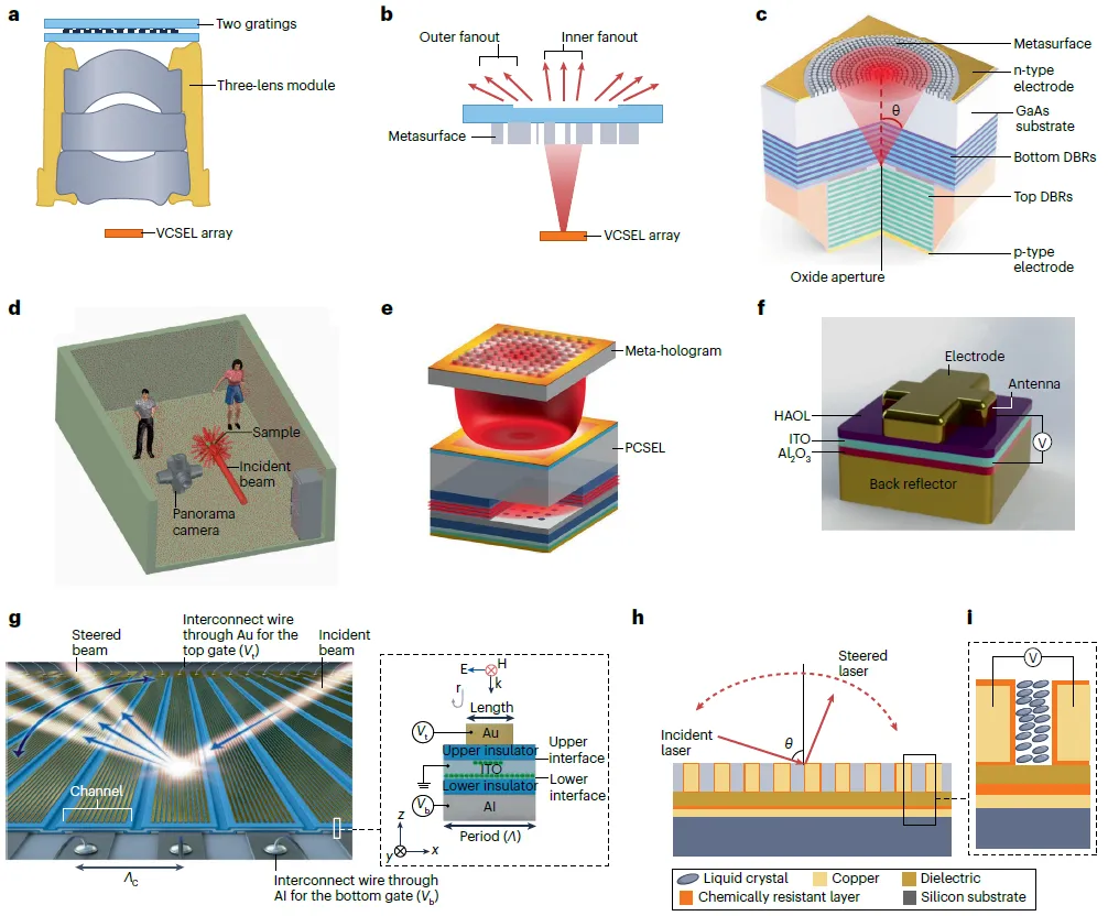 深度感知或空间计算已成为科技产品的重要趋势,例如最新手机搭载的短距激光雷达与人脸识别系统。人脸识别系统通过分析照射到人脸的阵列光点的反向散射光,来提取人脸的三维深度信息。其最主要的光学元件如图9a所示,包含一个VCSEL阵列、一个透镜模组和两个光栅,VCSEL阵列通常包含数百个发射单元,透镜模组用于准直VCSEL阵列发出的激光束(典型全角发散角约 20°),光栅将照明范围在水平和垂直方向均扩展至约80°,并将光点数量提升至约15000个,以提高空间分辨率。其实现方式为大角度与小角度扇出,即分别将透射光束复制到较大和较小的衍射角。最近,Metalenz和NIL Technology公司分别推出了将透镜与光栅功能集成到单个超表面的产品,如图9b所示,其一方面能够准直VCSEL光束,另一方面能够以小角度和大角度扇出将准直光束复制九次,显著简化了设计与供应链。此外,还有一些领域的进展,图9c展示了直接与VCSEL芯片集成的超表面,图9d展示了能够生成几乎覆盖整个空间的点阵图案的超表面,图9e展示了专为低发散角的单光子晶体垂直腔面发射激光器(PCSEL)设计的超表面点阵投影。