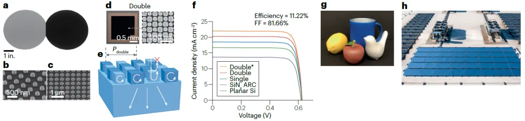 在光伏领域,如图11a-f所示,超表面被用于制备抗反射涂层与光捕获结构,以提升光电流并降低材料与制造成本。通过热氧化,可以为纳米图案表面获得高质量的表面钝化层,并在非常薄的电池中实现高能量转换效率,例如厚度<3µm的晶硅电池效率达11.2%。
