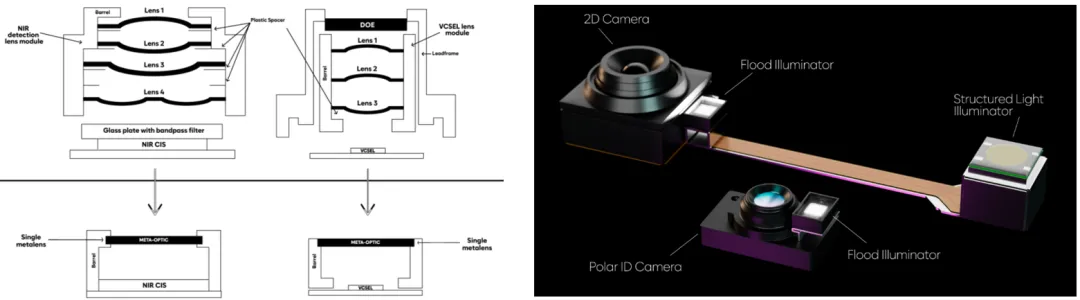 图12 | Metalenz的3D传感收发方案(左)和Polar ID(右)的示意图