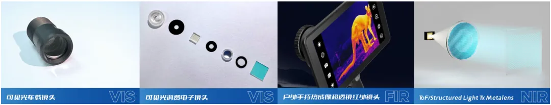 公司的主要产品如图14所示,包括可见光车载摄像头、可见光消费电子镜头、热成像超透镜红外镜头和ToF/结构光发射超透镜。