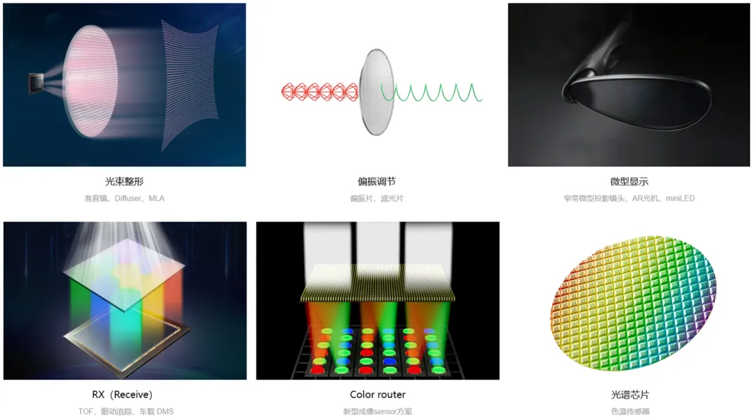 公司的主要产品如图16所示,包括光源调控系列和成像检测系列。其中光源调控系列有光束整形、偏振调节、微型显示,成像检测系列有RX、Color router、光谱芯片。