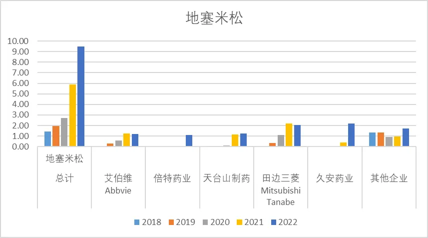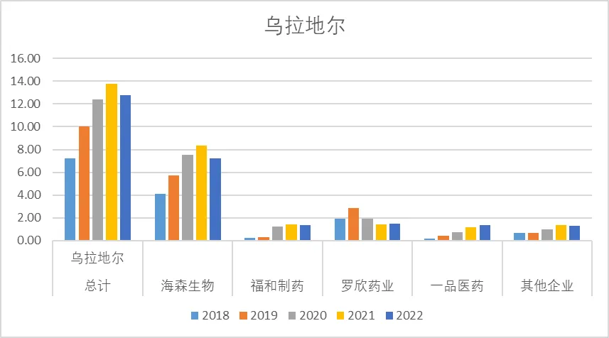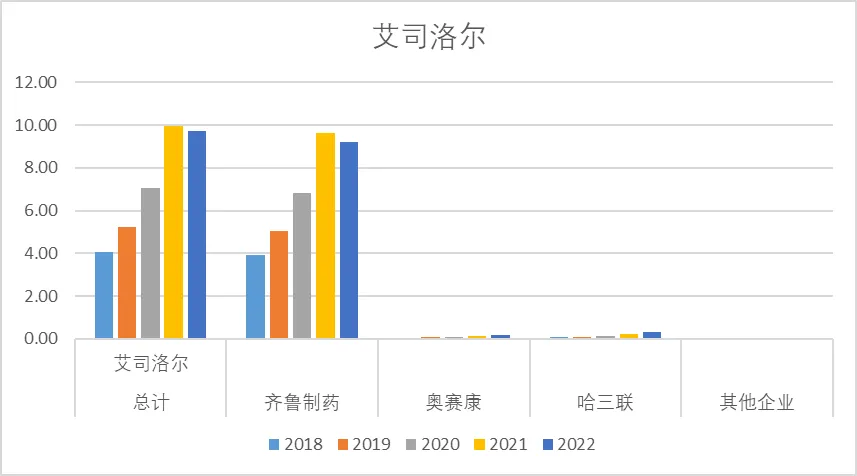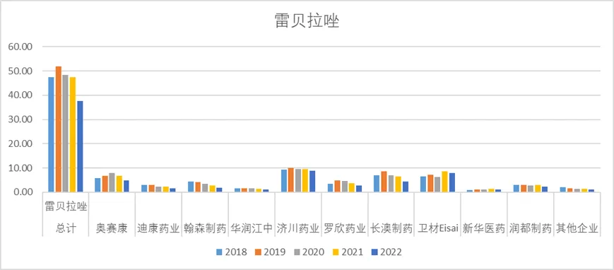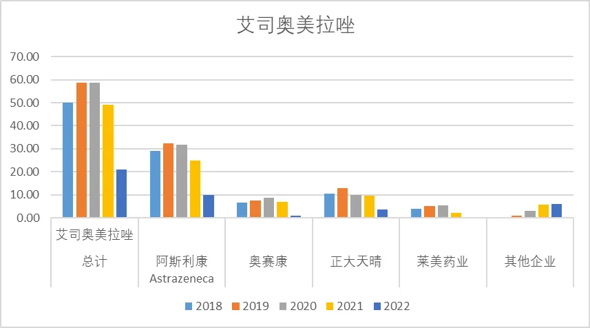 艾司奥美拉唑2022年销售额21.00亿,其中近几年销售额峰值约60亿,其中阿斯利康是绝对龙头,但近几年销售额逐年下降,目前阿斯利康的销售额在10亿左右,其他较头部的企业还有正大天晴、奥赛康、莱美药业等。