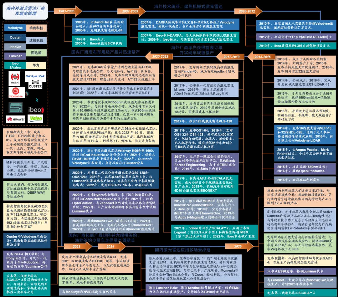 2013年起国内厂商入局,经过数年发展,海外厂商由于自身路径依赖、量产交付周期长、市场响应不足而错过车规级上车浪潮,在激光雷达市场竞争中逐渐“掉队”。