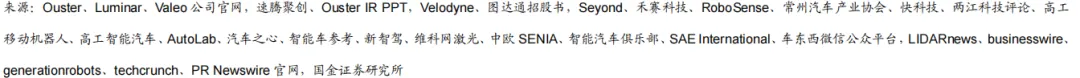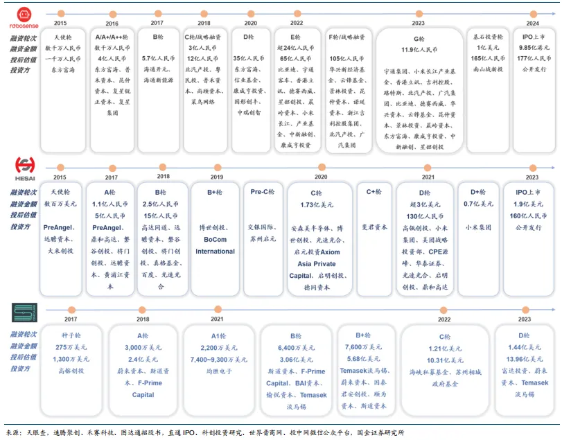 公司融资能力较强,资方包括头部车企、国际资本及地方国资。禾赛科技 2023 年美股上市时募资约 1.9 亿美元,上市前累计融资超 5 亿美元,投资方包括小米、百度、博世等。速腾聚创2024 年港股 IPO 募资 9.85 亿港元,上市前融资总额约 36.28 亿元,投资方包括比亚迪、吉利等。图达通成立以来备受资本青睐,获得多家主流车企、投行及基金的投资,至今完成 7 轮融资累计约 4.6 亿美元,D 轮融资后估值达 13.96 亿美元。从融资结构来看,蔚来自 A 轮领投后持续加码并成为最大客户,“产业+资本”双重绑定为公司提供稳定的订单和资金支持;苏州相城政府基金等地方国资的参与,强化了公司供应链和生产基地布局;淡马锡、富达投资等国际资本的加入,有望助力公司的全球化扩张。