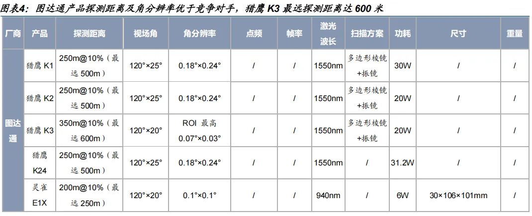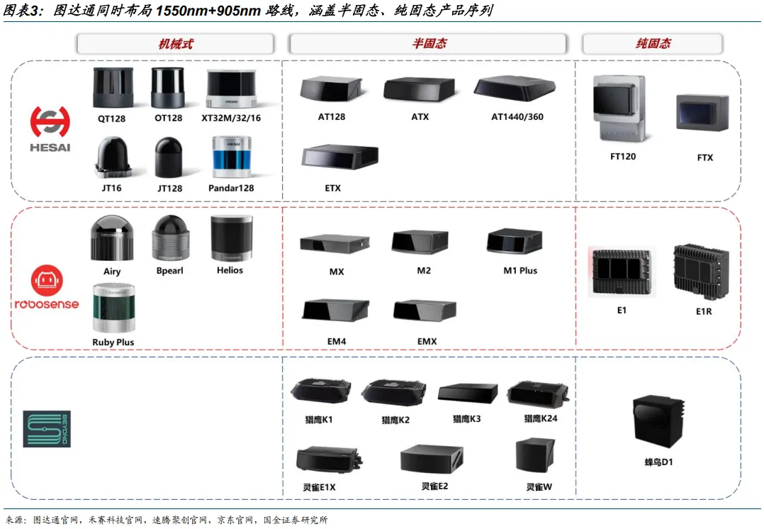 图达通同时布局 1550nm+905nm 半固态产品。禾赛科技、速腾聚创均布局多元技术路线,已具备机械式、半固态、纯固态激光雷达的成熟技术储备。相比禾赛、速腾聚创最初研发机械旋转式产品的选择,公司出于专利限制原因没有做机械式激光雷达,而是在创立之初选择1550nm 短波红外激光进行远距离探测,并开发了双轴镜面扫描技术架构,推出远距离激光雷达猎鹰系列。在中距离探测方面,公司选择 905nm 波段+单轴镜面扫描技术,推出灵雀系列,具有重量轻、体积小、功耗低及成本低的特点。猎鹰和灵雀均采用半固态扫描机制,与机械式扫描仪相比实现更小的尺寸、更高的分辨率及更高的可靠性。同时公司 2025 年 4 月推出蜂鸟系列首款产品蜂鸟 D1,采用纯固态设计,无机械损耗,适应机器人长期高频作业需求。