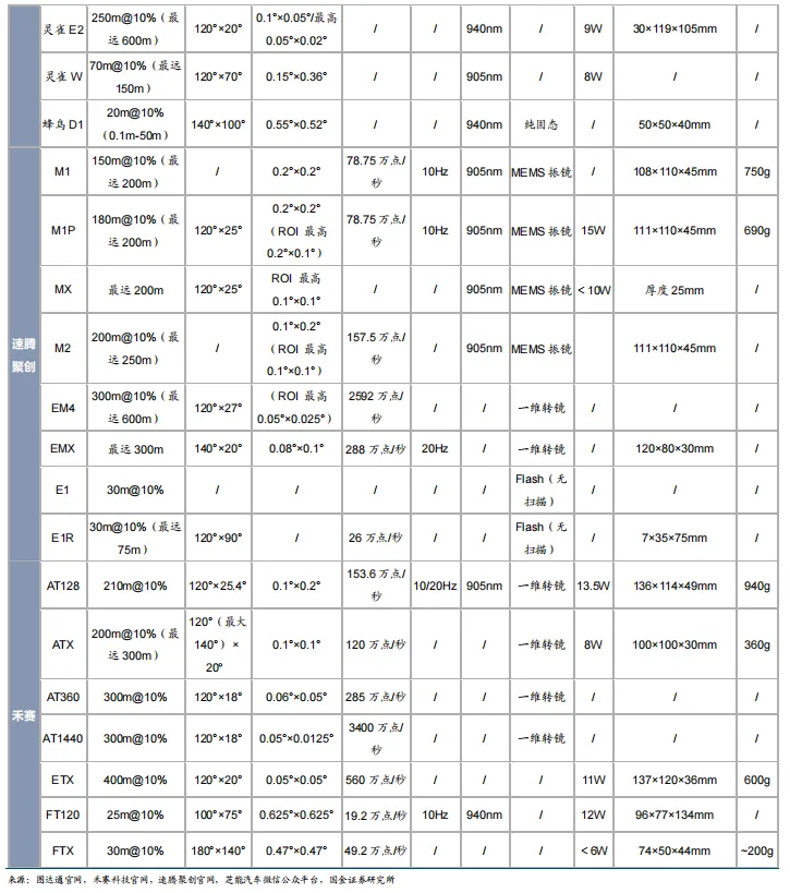 产品性能:1550nm+905nm 波段全面布局,探测距离、角分辨率等性能业内一流