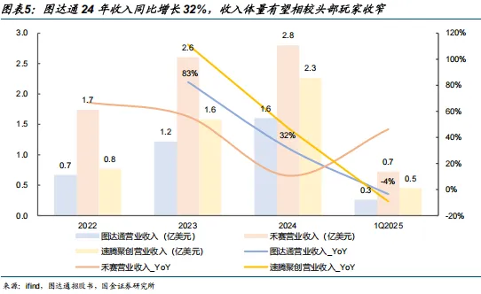 图达通过去两年收入增长强劲,2023 年/2024 年全年收入分别同比增长 83%/32%。目前,图达通收入体量与行业龙头禾赛、速腾聚创仍存一定差距,22~23 年禾赛营业收入均远超公司一倍以上。