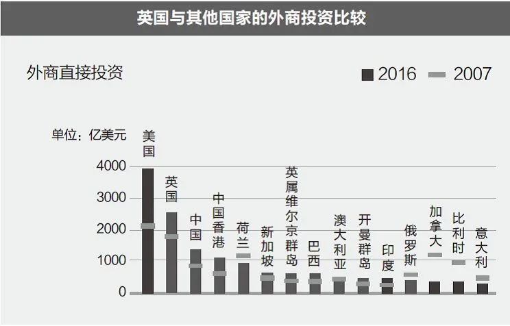 我们立于科技和创新发展的前沿,吸引了包括德国、法国和中国在内的许多主要国家的海外投资(见图“英国与其他国家的外商投资比较”);