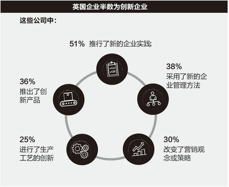 根据英国的创新调查,我们一半以上的企业被归类为创新企业(见图“英国企业半数为创新企业”),这意味着我们还有很大的潜力。但同时也要应对以下几个关键挑战: