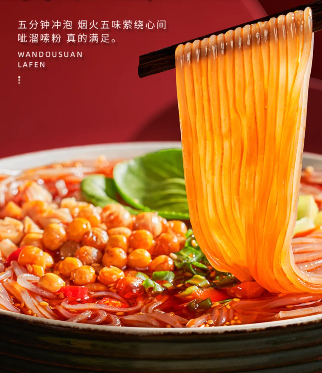 为了找到最能够激发消费者食欲的图片,我们找到了粉落入碗里的动态瞬间,让整体画面显得更加有烟火气,越有烟火气的食物画面就越能勾起消费者食欲。