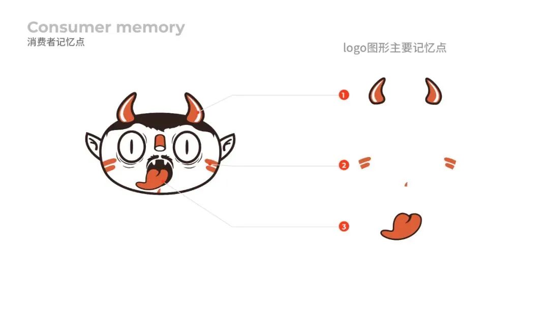最终,我们经过上百个随机消费者的电话机访谈发现,顾客对食族人品牌符号的核心记忆点集中在三个标志性的地方:角,脸上的花纹,和舌头