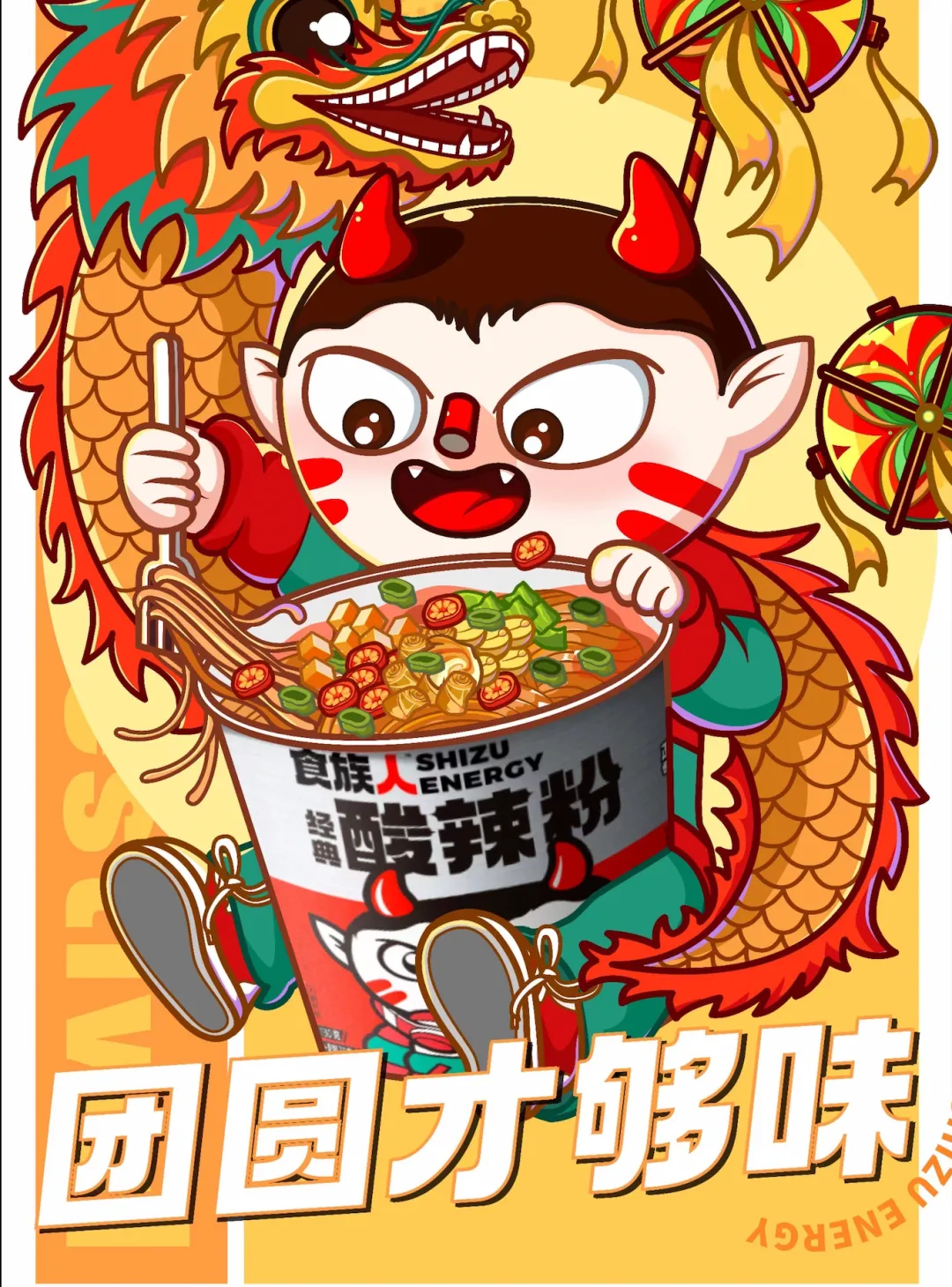品牌视觉传达上就“很会玩”,通过“辣巫师”这一形象延展“食族人家族IP”,推出许多产品周边,通过区别传统速食品牌的视觉脱颖而出。