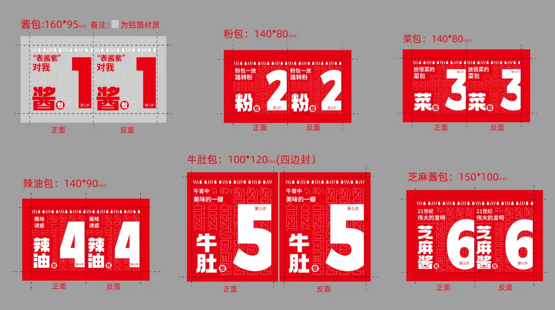 在产品口味测试中,我们发现想要获得最佳的口感,醋包和花生包需要酸辣粉泡开之后再放入,才能保持醋的酸爽和花生的酥脆,于是我们将产品的酱料包装作为指引,通过6步引导让消费者享受食族人酸辣粉的最佳口感。(下图为爆肚粉内包装展示)