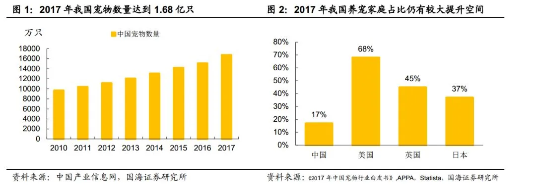 2017 年我国宠物数量由 2010 年的 9691 万只大幅增加至 1.68 亿只。养宠家庭占比也达到 17%,但相较美国 68%家庭饲养宠物,仍有较大提升空间。