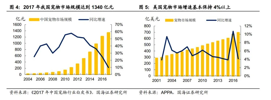 2017 年,中国宠物市场规模为 1340亿元, 过去十年 CAGR(复合年均增长率) 达到 38.94%;同期美国宠物市场规模为 695.1 亿美元,约为中国市场的 3.5 倍。尽管美国宠物行业早已进入成熟期,并且近年来也遭遇过金融危机等不利因素冲击,但 2001 年以来其每年增速基本均在 4%以上。