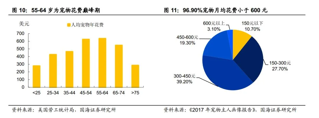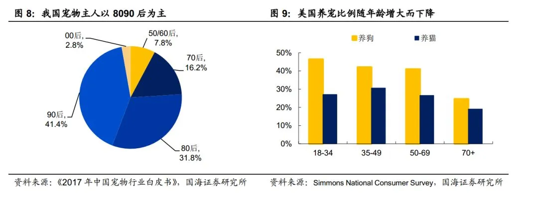 根据《2017 年中国宠物行业白皮书》显示,我国 80%的宠物主人均为 80、90 后。而美国宠物市场的数据也进一步印证了我们的观点——饲养宠物比例随着年龄增加反而减少,尤其当年龄超过 50 岁后,饲养比例下降尤为明显。我们认为这主要与年龄增大后体力精力下降有关,事实上 40 岁前更容易形成养宠习惯。