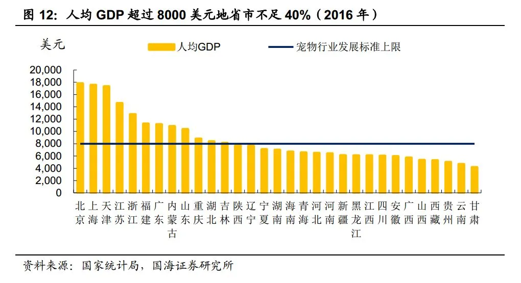 多数省份宠物市场尚未启动,行业增长潜力依然巨大。 佩蒂股份招股说明书中提到,当国家人均 GDP 在 3,000-8,000 美元时,宠物行业开始快速增长。 尽管2016 年我国人均 GDP 已达到 53817 元(约合 8100 美元), 已经突破了行业快速增长标准上限。 但由于我国幅员辽阔,地域经济发展差异较大。 除港澳台外,人均 GDP 超过 8000 美元的省市实际仅有 12 个,其余 19 个省市均未触及 8000美元的宠物行业发展标准线,多数地区宠物市场尚未启动,这也意味着行业未来增长潜力远超市场预期。