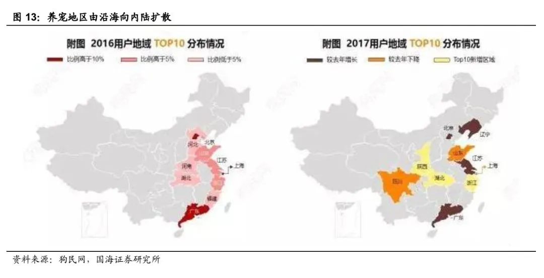 宠物市场由沿海向内陆扩散,新兴市场成为重要增量。 根据狗民网数据显示,2016 年我国养宠人士主要集中在经济发达的沿海地区;而到了 2017 年, 地处内陆的四川、陕西也已经成为了前 10 大宠物分布地区,宠物市场由沿海向内陆扩散的趋势十分明显。我们认为随着国内经济的持续发展,相对落后的内陆省市宠物市场有望陆续进入爆发期。越来越多增量区域的出现或许将是未来中国宠物市场发展的重要推动力。