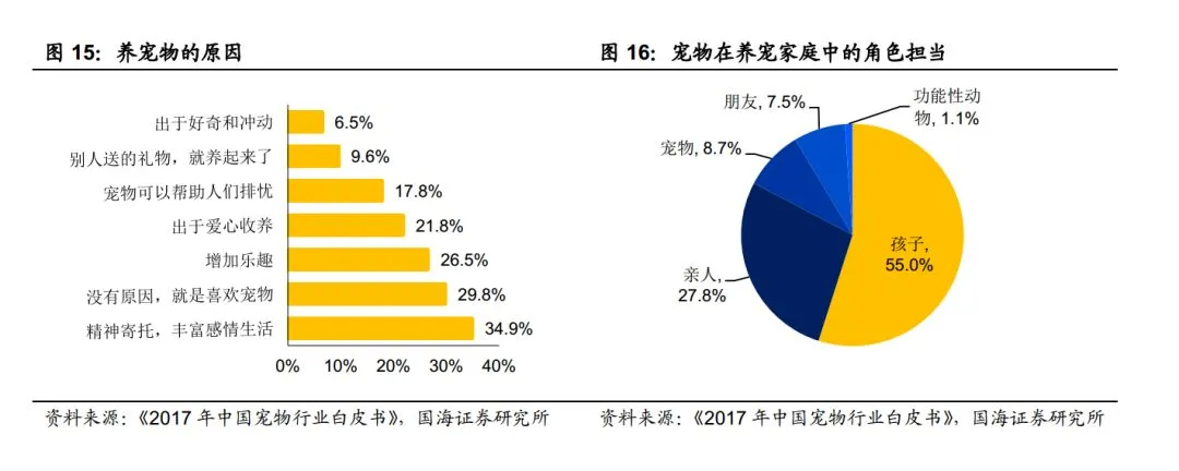 养宠首要目的是作为精神寄托。《2017 年中国宠物市场白皮书》的调查显示,“精神寄托,丰富感情生活”赫然成为中国养宠物的首要原因;而从宠物在家庭中扮演的角色来看,“孩子”、“亲人” 这类精神寄托对象占比超过八成。