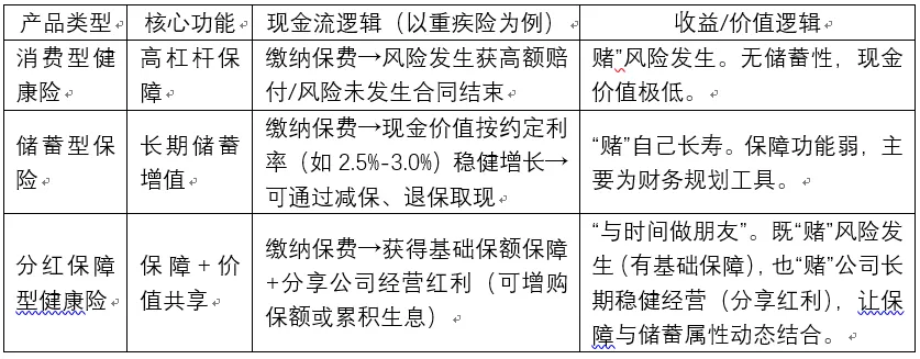 保障基础先行原则不可动摇:重申配置逻辑:第一梯队:国家医保+百万医疗险(解决大额医疗费报销)。第二梯队:足额消费型重疾险(解决收入中断、康复营养等)。在此之后,如果仍有预算且追求保障的长期增值和资产配置的多元化,再考虑第三梯队的分红型长期健康险。它是“升级配置”和“优化组合”,绝不能替代基础保障。 流动性提醒:长期锁定的代价:这类产品通常有较长的缴费期和现金价值积累期。前期退保损失可能较大。它不适合短期内有明确大额支出计划(如购房、创业)的家庭,更不是随时可取的“活期存款”。投保前,必须审视家庭的中期现金流规划。