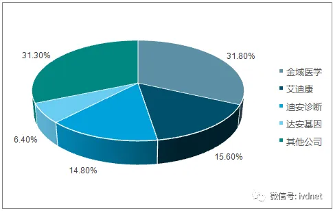 目前我国第三方医学检验市场呈寡头垄断的格局。据统计,我国独立医学实验室已近500 家,但大部分规模较小、区域性经营,或专注于特色检验项目,而金域医学、艾迪康、迪安诊断和达安基因是实行全国连锁经营且规模较大的综合性独立医学实验室,按前瞻网数据96亿市场规模计算,上市公司金域医学市占率约为31.8%(2016年检验服务营收30.5亿元,下同),迪安诊断为14.8%(诊断服务营收14.2亿元),达安基因为6.4%(服务营收6.2亿元),艾迪康服务医疗机构客户15000余家,客户数量略大于迪安诊断,预计与迪安市占率相当,四大龙头市占率合计约占七成,寡头垄断竞争格局