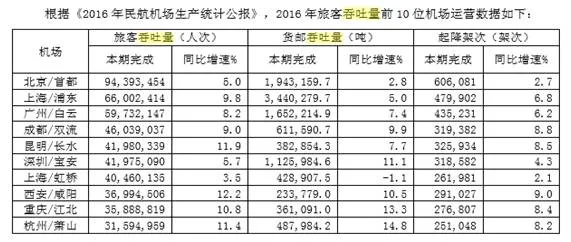 白云机场是我国华南地区航空枢纽,客运量仅次于首都机场、上海机场,排名国内第三,2016年飞机起降43.5万架次、旅客吞吐量为5974万人次,仅比上海机场(浦东)48万架次、6600万人次低10%左右。