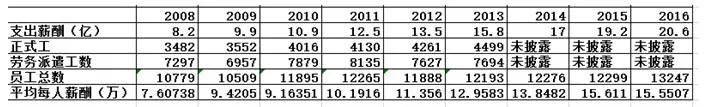 我翻阅白云机场2008年以来的年报,查询薪酬支出和员工数量,得到下表