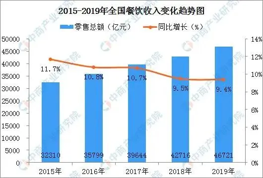 2019年全国餐饮收入46721亿元,同比增长9.4%。全国餐饮收入同比增速(9.4%)高于同期社会消费品零售总额增长(8%),餐饮消费成为国内消费市场的重要力量。从餐饮行业近五年数据来看:自2015年起,全国餐饮收入保持着两位数稳定增长。2015年全国餐饮收入达32310亿元,同比增长11.7%,达到近几年来增速峰值。由于庞大的收入基数以及经济下行压力的影响,行业整体增速减缓,较上年同期增速下降0.1个百分点。