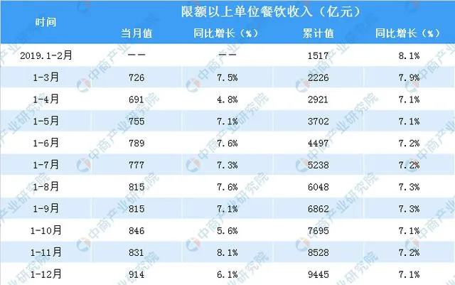 据国家统计局公布的最新数据显示,2019年12月,全国餐饮收入4825亿元,同比增长9.1%;1-12月,全国餐饮收入46721亿元,同比增长9.4%;其中,1-12月,全国限额以上单位餐饮收入9445亿元,同比增长7.1%。