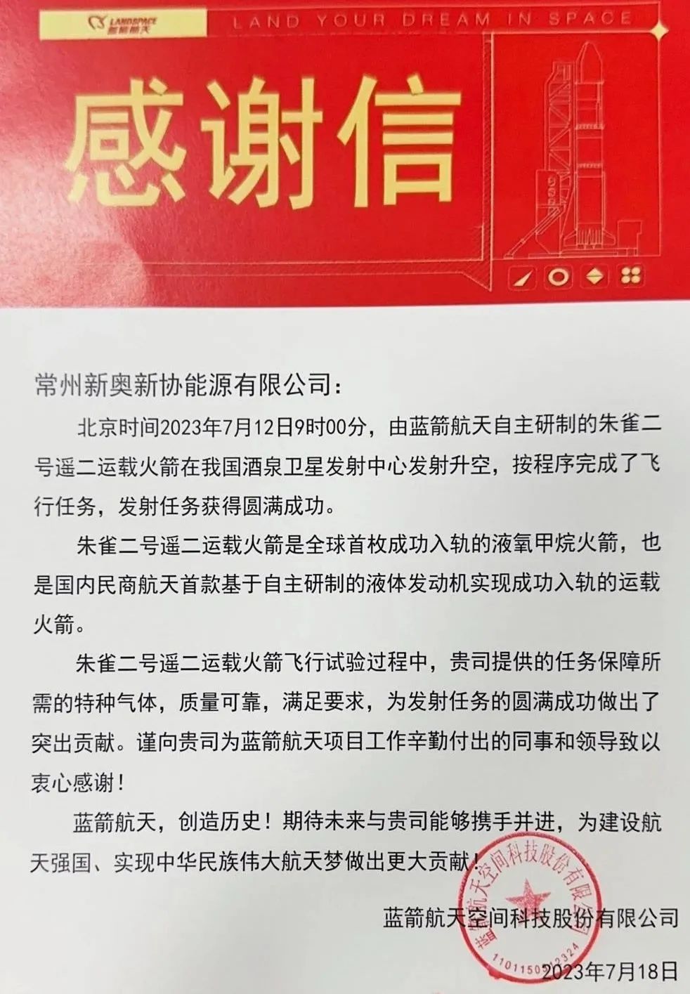 近日,绿建区企业常州新奥新协能源有限公司收到了来自蓝箭航天空间科技股份有限公司的感谢信,对新奥参与保障该公司成功发射“朱雀二号”火箭表示衷心感谢。