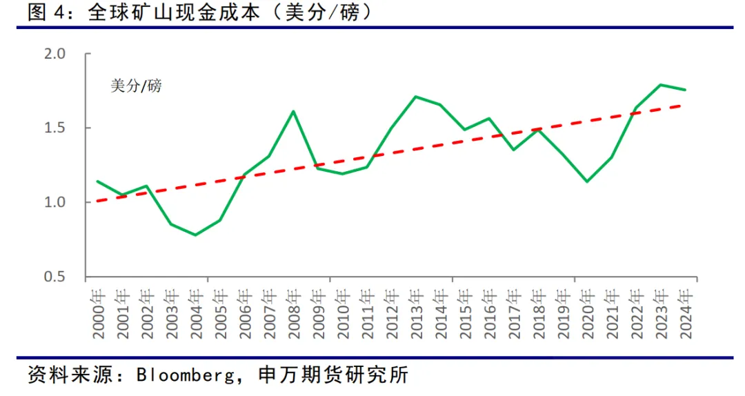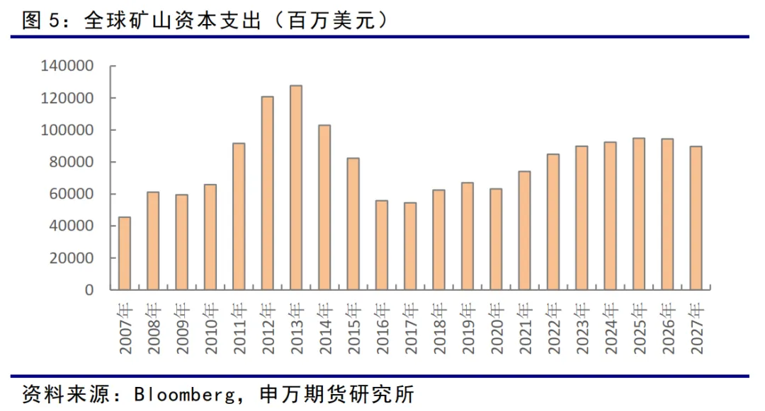 由彭博统计的全球主要矿企资本支出来看,2022-2025年增速逐年下降,将可能导致未来新增矿供应增速明显放缓。由于矿山建设周期通常需要5-8年,所以近年来全球主要矿企投资增速的放缓,大概率意味着未来可供应的铜矿增速放缓。
