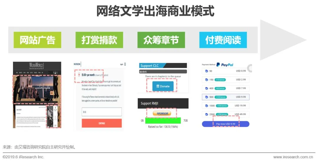 网络文学出海在逐渐发展的过程中,行业各方也在努力建构着适合出海业务发展的商业模式。从最初的海外翻译网站建立的广告模式到后续的打赏捐款及众筹章节,成为早期支撑网文出海取得收入的方式。随着海外网文平台的建立及规模化发展,在不断摸索海外市场的基础上开始逐渐尝试付费阅读的商业模式,通过借用国内已经非常成熟的付费阅读推行经验来积极建构网文出海业务较为标准化的商业模式,以多元化的探索推动向付费阅读深入发展。