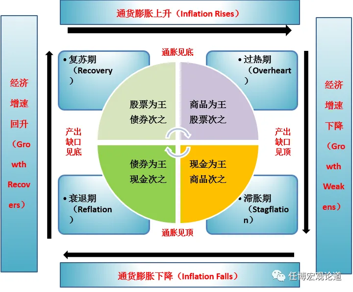 (4)滞胀阶段(经济下行+通胀上行):企业因盈利受到冲击而提高产品价格,导致通货膨胀继续上行,经济增速开始回落,但货币政策仍难以从紧缩向宽松过度,此时股票表现不佳,投资标的依次为现金>债券>大宗商品/股票。