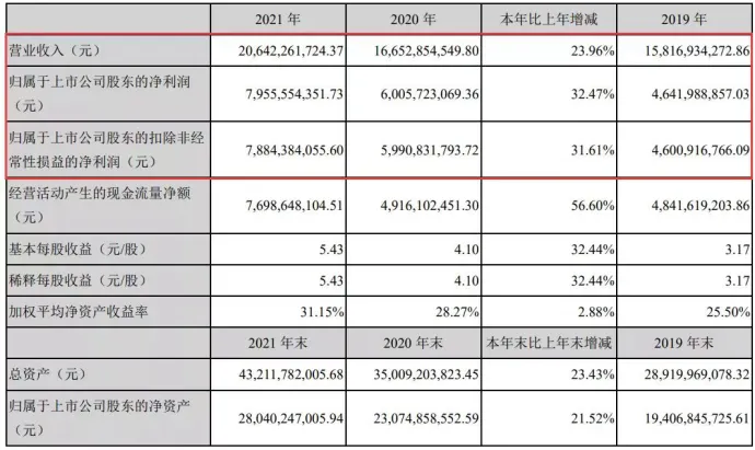 4月28日晚,泸州老窖股份有限公司发布2021年年报与2022年一季报。报告显示:2021年度实现营业收入206.42亿元,同比增长23.96%;实现归属于上市公司股东的净利润79.56亿元,同比增长32.47%。