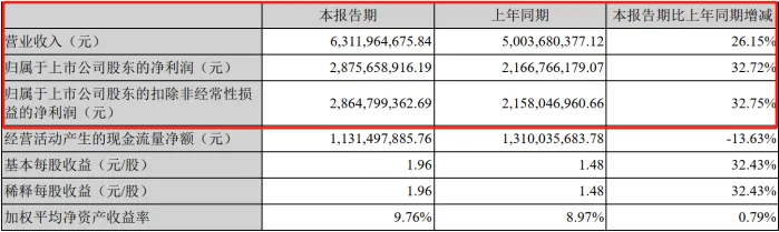 2022年一季度报告显示,实现营业收入63.12亿元,同比增长26.15%;净利润28.76亿元,同比增长32.72%。