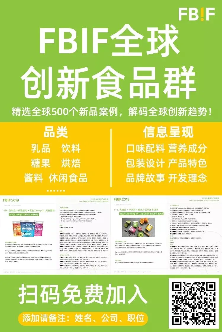 长按识别二维码,后台回复“2”加入全球最大食品微信群(4万+食品人已加入)!微信群包括:CEO、食品综合、乳品、饮料、酒、咖啡、酸奶、烘焙、茶饮料、啤酒、零食、新零售、特医食品、调味品、餐饮、代工、营销、研发、设计、包装等。