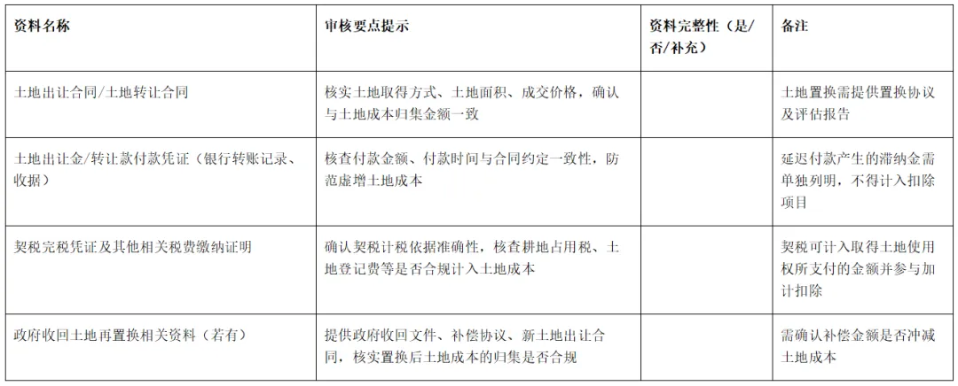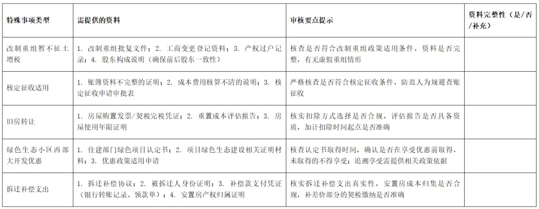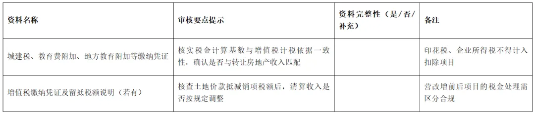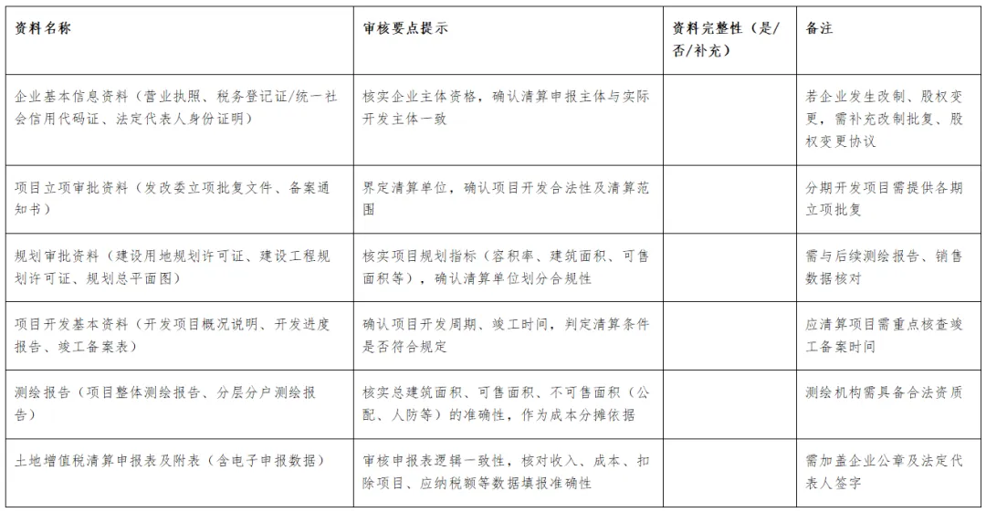 适用税务机关对房地产开发企业土地增值税清算申报的审核工作,用于系统性归集、核查清算相关资料,确保审核全面、合规、高效。
