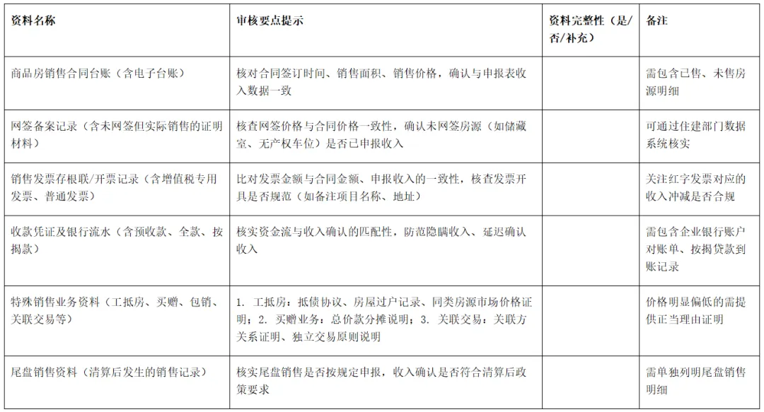 1. 常规收入审核:核查销售合同、网签备案记录、发票开具信息的一致性,确保销售收入全额申报,重点关注未网签备案但实际销售的储藏室、车位等资产的收入确认。
