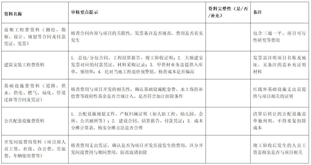 建安成本:比对当地工程造价预警值,审核大额建安发票对应的合同、结算报告、付款凭证完整性,防范虚增建安成本;对甲供材业务,核查入库及领用记录,防止重复扣除。
