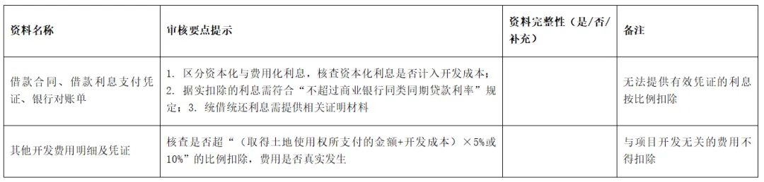 其他开发费用:按“取得土地使用权所支付的金额+房地产开发成本”的5%或10%比例扣除,审核企业是否超比例申报。