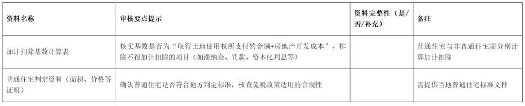 5. 加计扣除:审核加计扣除基数是否包含全部允许扣除的成本,排除资本化利息、税金等不得加计扣除的项目;对政府性基金(如基础设施配套费),按政策规定确认是否允许加计扣除。