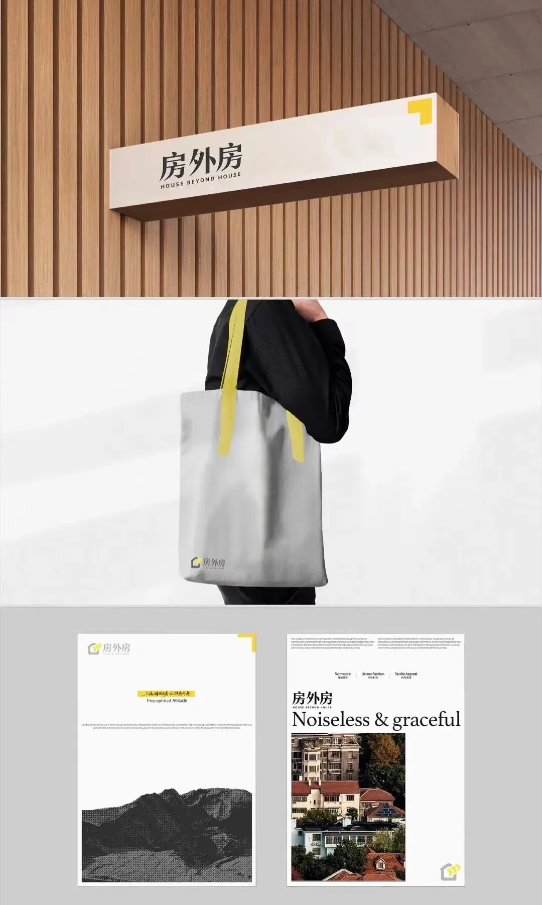 全新标识结合现代的字标处理方式,并使用富有温暖感受的帝国黄,以及专业卓越的极致灰,两大主色调,旨在向外传递品牌的专业的同时,也让客户感知房外房服务的温暖。