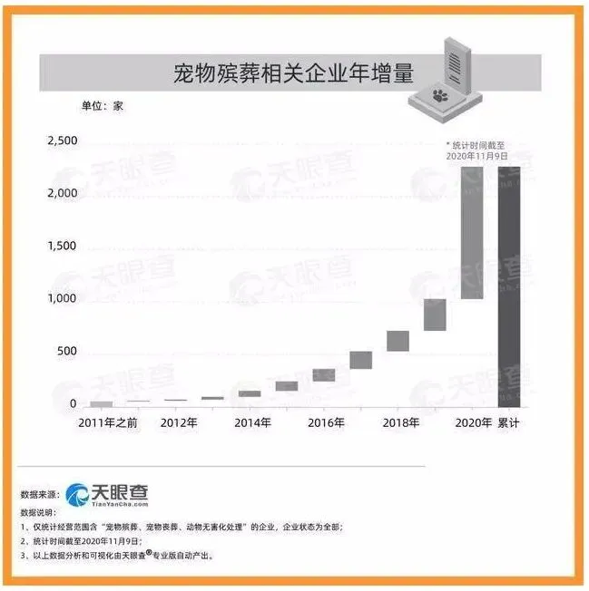 值得注意的是,截至11月,我国今年共新增超过1,200家宠物殡葬相关企业(全部企业状态),同比增长447%,已经超过历史相关企业增量之和。
