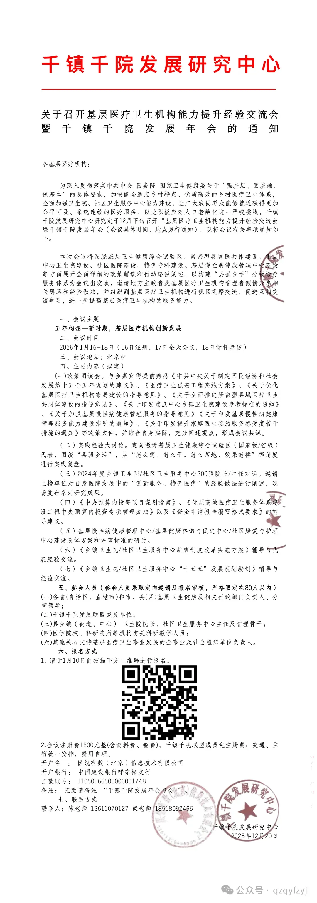 为深入贯彻落实国家关于“强基层、固基础、保基本”的总体要求,加快健全适应乡村特点、优质高效的乡村医疗卫生体系,全面加强卫生院、社区卫生服务中心能力建设,以此积极应对人口老龄化这一严峻挑战,及时了解和深入学习国家关于医疗卫生强基工程的最新政策和学术动态,千镇千院发展研究中心研究定于1月16-18日在北京召开“基层医疗卫生机构能力提升经验交流会暨千镇千院发展年会(会议具体时间、地点另行通知)。