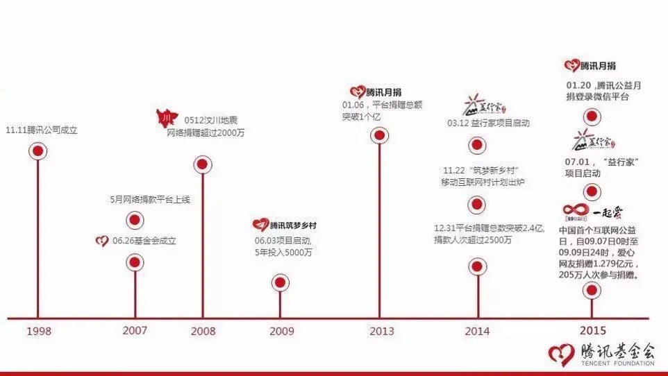 在腾讯成立的第十个年头也就是2007年,腾讯公司成立了公益基金会。随后,这个基金会一直在高质量运营:2008年为汶川大地震捐款超过2000万元;2009年,启动“筑梦乡村”计划,连续5年合计投入5000万元;2013年启动“月捐”计划,腾讯平台捐赠总额突破1个亿……