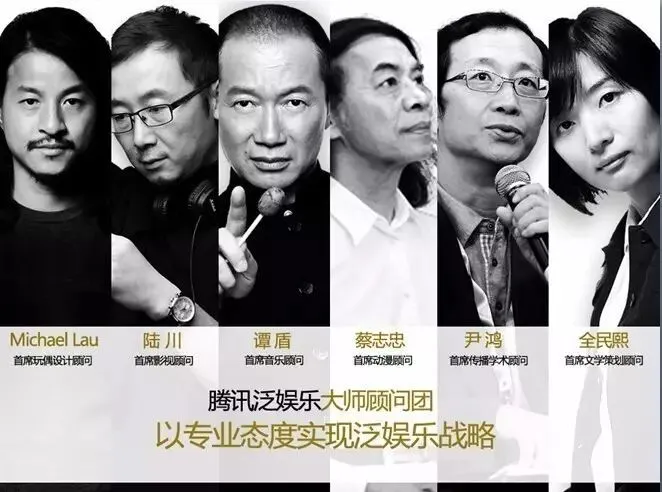 为了实现以专业态度打造泛娱乐布局,践行泛娱乐战略,腾讯专门聘请了六位分别在音乐、漫画、传播、电影、玩偶、文学领域卓有成就的重量级人物,组成“大师顾问团”,并凭借这些大师的专业造诣,对腾讯娱乐在不同的艺术、商业领域进行专业指导。