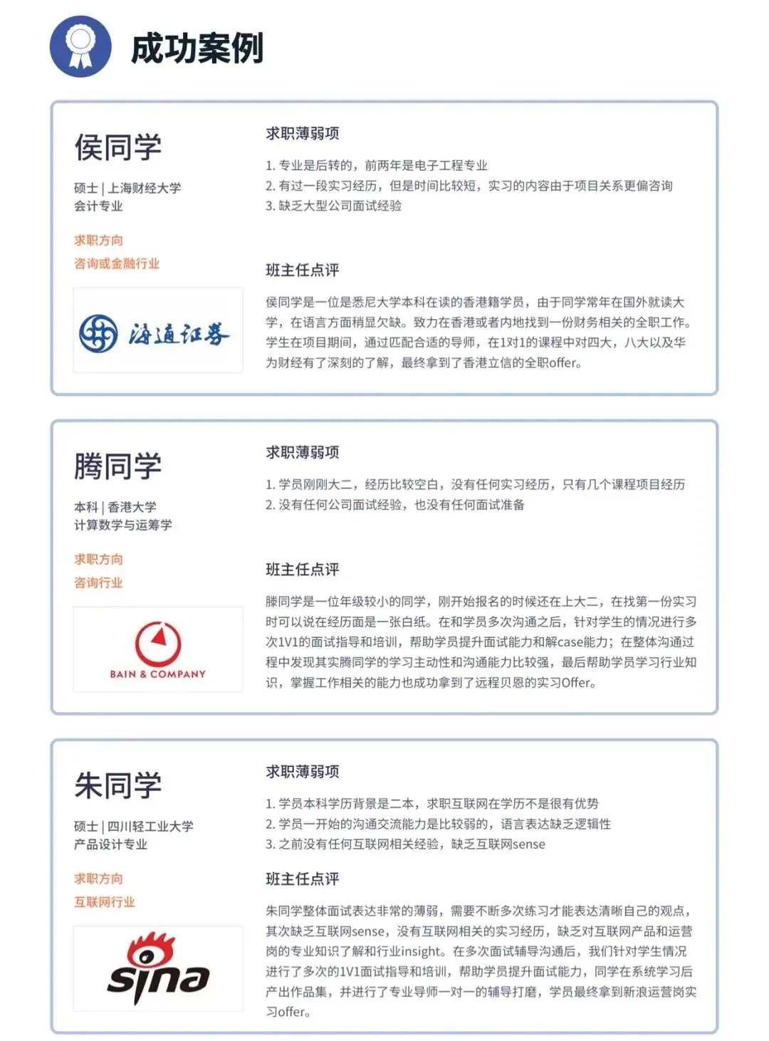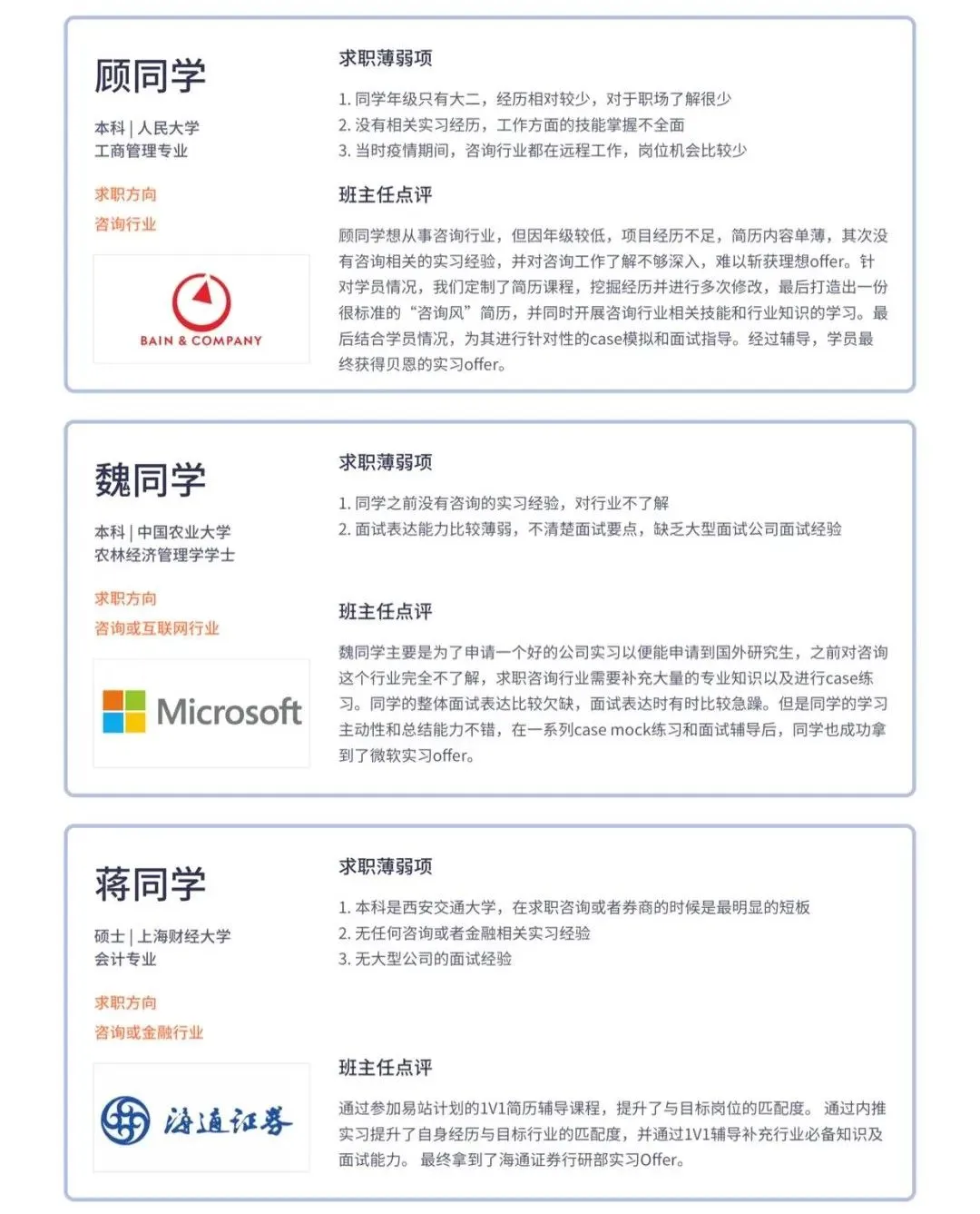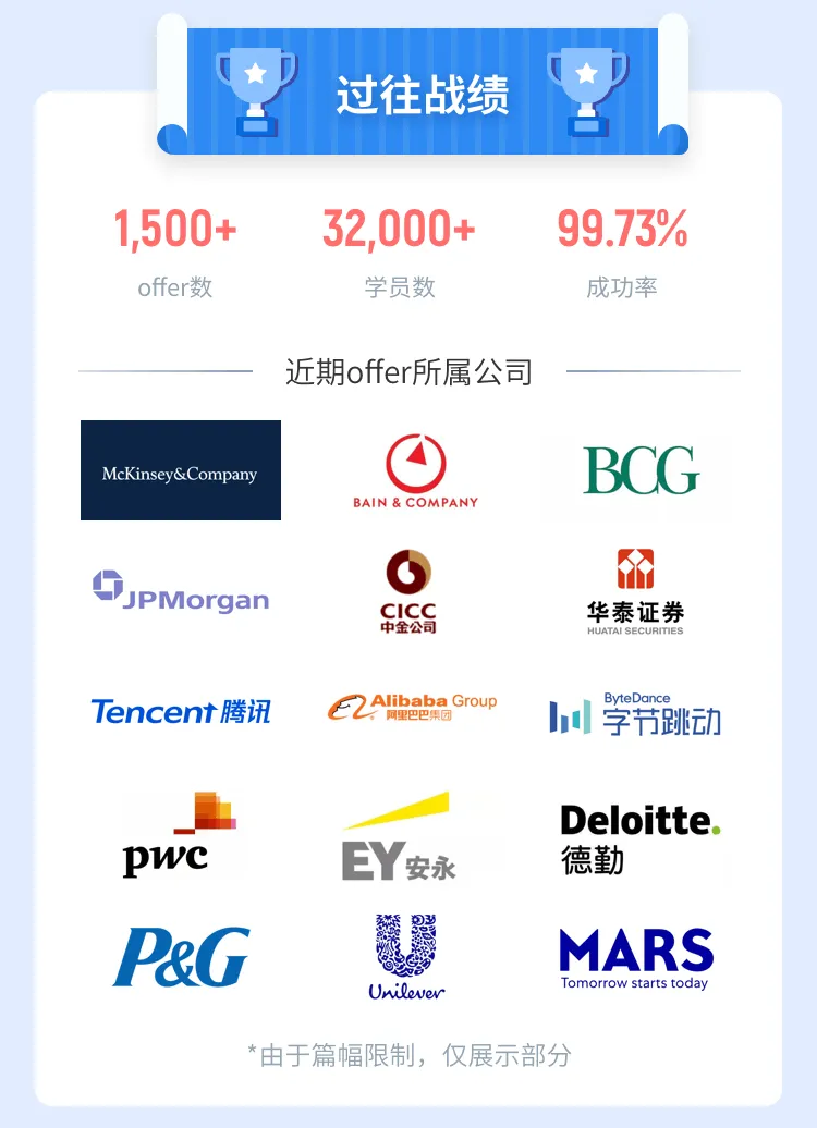同时,我们还会请世界Top 3咨询公司的在职面试官导师,为同学进行实战case interview模拟,我们的班主任以及业内的导师,前后为同学一共模拟训练过近30个case。全职面试的时候,那个面试官都以为小D曾在咨询公司全职工作过,非常顺利地通过了面试